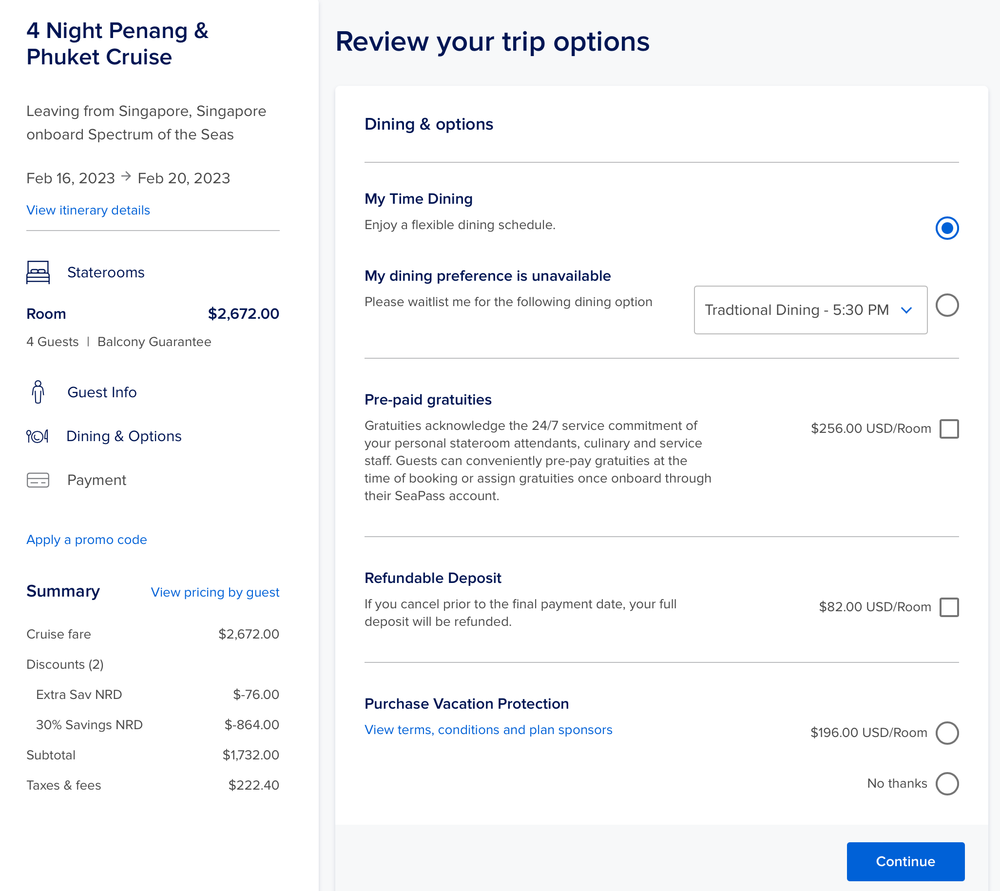 가격까지 확인을 하고 나면 식사, 팁, 리펀드 관련 오션을 선택합니다.