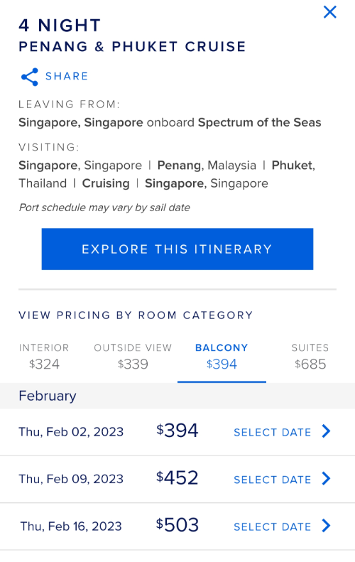 페낭/푸켓 4박 일정을 선택하면 객실 타입별 가격과 운행 일정을 확인할 수 있습니다.