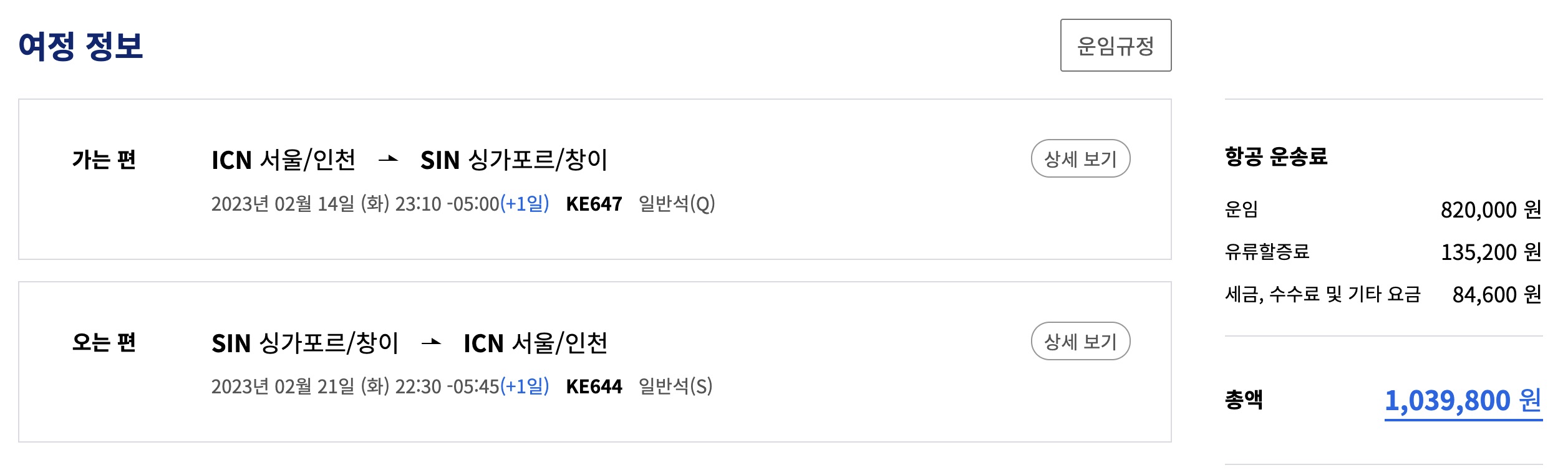 2월 14일 인천 출발 2월 21일 싱가포르에서 복귀하는 항공권 4장을 140,000 마일과 수수료 350,400원에 구입을 하였습니다.