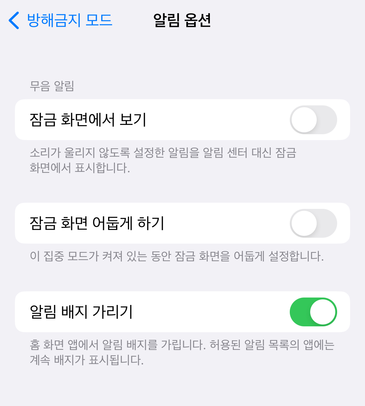 알림 허용 아래에 있는 옵션 항목으로 들어가면 알림에 대한 옵션을 선택할 수 있습니다. 소리가 울리지 않도록 설정한 알림을 알림 센터에 대신 잠금화면에 표시할지, 그리고 잠금 화면을 어둡게 표시할지, 알림 배지를 가릴지에 대한 설정을 할 수 있습니다.