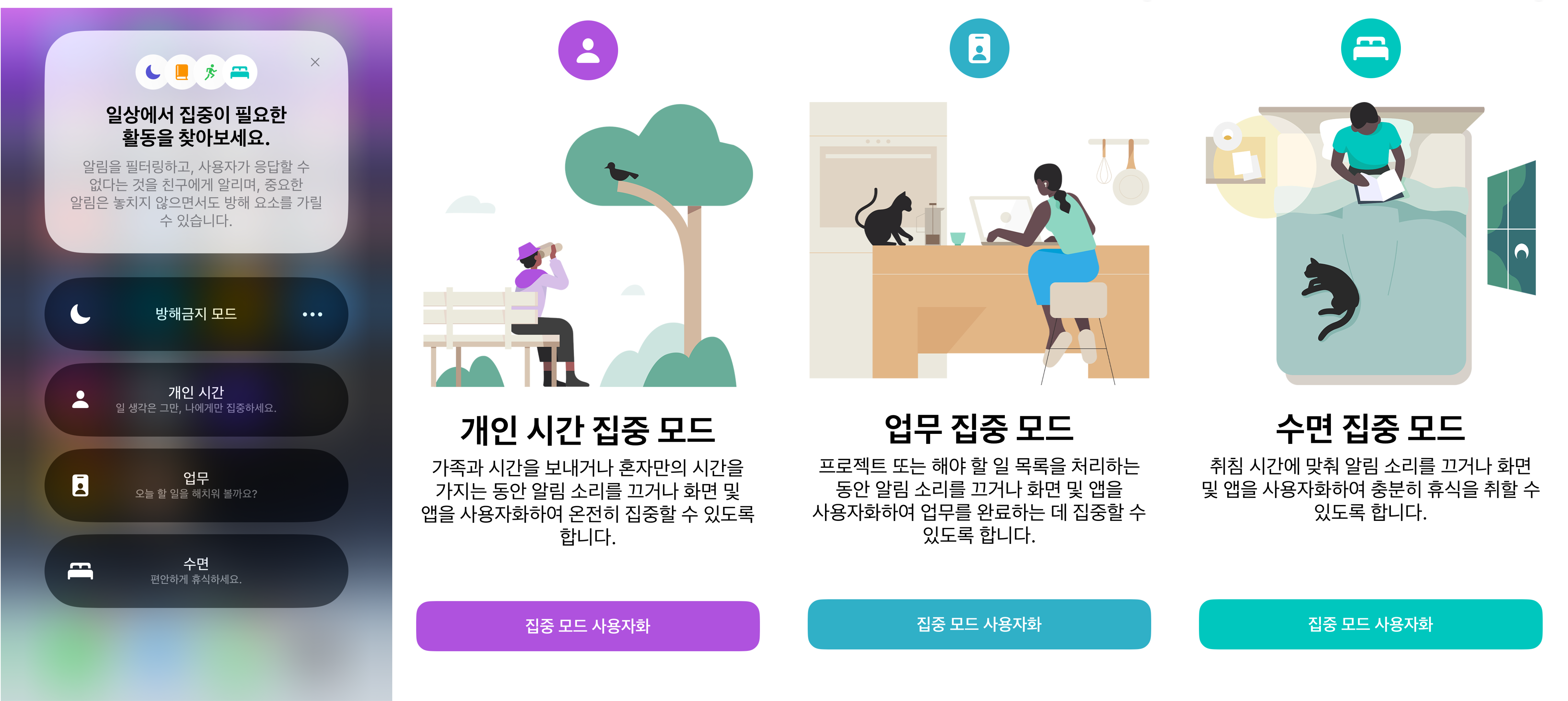 아이폰의 집중 모드는 방해 요소를 최소화하고 경계를 설정할 수 있도록 돕는 기능입니다. 우리가 공부를 하거나, 일을 하는 등 특정 활동에 집중할 때 일시적으로 모든 알람을 무음으로 설정하여 해당 일에 집중할 수 있게 도와주는 기능입니다. 집중 모드는 기존에 제공하던 '방해금지 모드(Do Not Disturb)'의 업그레이드 버전이라고 생각하시면 됩니다. 집중 모드의 경우 방해 금지 모드와 달리 맥락 인식과 세밀한 설정을 통해 사용자가 현재하고 있는 일에 집중할 수 있도록 도와줍니다.