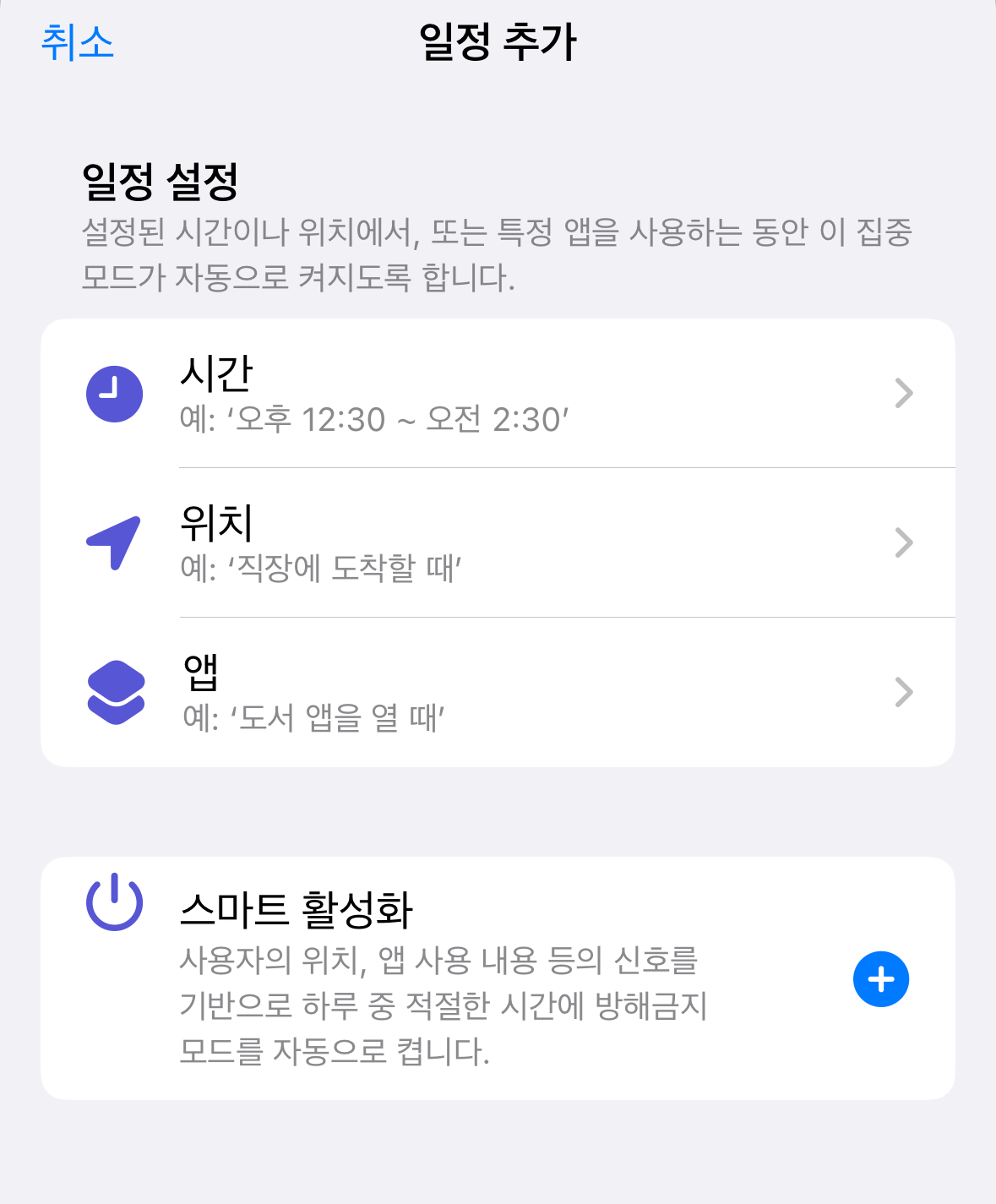 그리고 일정 설정을 통해 방해금지 모드가 동작하는 특정 시간 및 장소를 설정할 수 있습니다. 만약 특정 장소 예를 들어 '회사' 위치 또는 매일 특정 시간 동안 반복적으로 사용하고자 한다면 여기서 상세 설정을 진행할 수 있습니다.